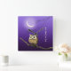 Una lechuza marrón con ojos brillantes sentada en una rama bajo la luz de la luna. Cielo nocturno azul profundo, luna brillante. Nombre personalizado, tipo de letra caligráfica. La lechuza es una obra de arte derivada de una imagen japonesa vintage de principios del siglo XX (alojada en Rijksmuseum).
