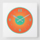 Un diseño de reloj en naranja y verde agua en un fondo blanco. Relojes simplistas y de buen gusto por Orientcourt. Coincide con la decoración con muchos colores y diseños elegantes.