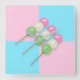 Se ha añadido al diseño "Dango Away" un fondo de cuadros azules y rosas que recuerda a los pétalos de Sakura flotando suavemente a través de un cielo primaveral fresco. La adición de una ligera sombra ayuda al dango a reaparecer.