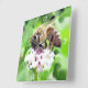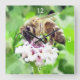 La abeja de miel recolectando polen de una flor está a la izquierda de la tarjeta. Fotografía de primer plano vista desde el lateral, las piernas, el cuerpo, los ojos, las alas y las antenas son claramente visibles contra el fondo verde.