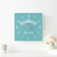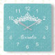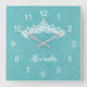 Este reloj de pared está impreso con una linda imagen de tiara tallada en un fondo azul verde azulado y giratorio. Tiene números blancos simples y fáciles de leer y un nombre personalizado. Seguro de complacer a cualquier niñita que ame los temas de la princesa. Su elección de cuadrado o redondo.