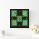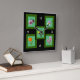 Hay cinco flores diferentes (ciruela, iris, daffodil, caléndula y lila) sobre fondo claro con marcos verde oscuro. Una imagen se sienta en cada esquina con el quinto lugar de imagen sobre ellos en el centro. Los marcos se establecen en el fondo negro. Números blancos en 12, 3, 6 y 9 posiciones.