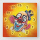 En este diseño de reloj, un retrato de un payaso de colores brillantes, riéndose con un gorra en la parte audaz de su cabeza y el pelo rosado a ambos lados de su cabeza. El fondo es amarillo intenso y naranja, con estrellas brillantes.