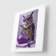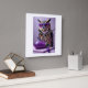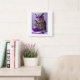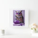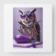Reloj de pared divertido con la foto de un búho usando gafas de sol moradas, cortando una berenjena morada