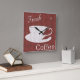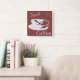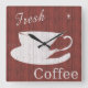 Reloj de café con una pizarra de aspecto vintage en rojo.