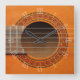 Un cierre de una guitarra clásica o española con una roseta decorativa alrededor del agujero de sonido en un reloj con números romanos blancos. Disponible como reloj redondo o cuadrado.