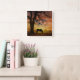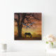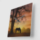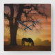 Este hermoso reloj de un caballo y roble con silueta y una puesta de sol al suroeste.