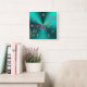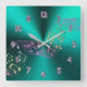 Reloj de notas de música metálica verde azulada. Luminoso gradiente de aspecto metalizado en tonalidades frescas de verde azul con un equipo ondulado de notas musicales de color arcoiris, rodeado de vidrio como números de lavanda. Un equipo muy amplio con notas musicales de colores añade un toque adicional a este reloj de pared para tu músico o amante de la música favorito.