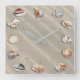 Casas de mar en la playa, imagen en un reloj de pared. 12 conchas dispuestas alrededor del reloj cuadrado de pared. Cada concha de mar indica la hora. Cada concha es diferente y corresponde a una hora, además hay un arreglo de horas numeradas de 1 a 12, Cada número parece un poco enterrado bajo la arena. Hará un hermoso regalo de casa para una casa de vacaciones. Idea para volver a casa con recuerdos en la playa.