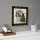 Reloj de vacaciones con una vintage escena de la ventana de Navidad del árbol de Navidad y luces brillando por la noche junto a una hermosa ventana, borde verde y números destacados.
