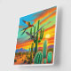 Este es un original y colorido fondo suroeste con un loro volando en la nativa puesta de sol norteamericana del gran oeste. Este es un bonito escenario decorado con naranjas, rojos y verdes con cactus en el fondo.