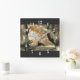 Este reloj de pared muestra un gran pavo salvaje que encontró un momento de paraíso a la sombra de dos robles en un caluroso día de verano.