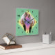 gato calico de pelo largo viendo su imagen reflejada, parado frente a una forma de diamante en colores arcoiris pastel. El gato es mayormente blanco con marrones y pieles con motivos negros. Números negros.