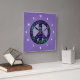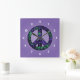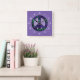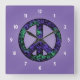 Este reloj lindo tiene un signo de la paz púrpura, verde y negro manchado.