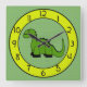 Tonos verdes y amarillos-verdes con un gran dinosaurio verde en un reloj de pared. ¿La decoración de una guardería, una sala de juegos para niños o un dormitorio para niños? ¡Un reloj lindo es el accesorio perfecto! Este reloj también haría un recién nacido inolvidable o un nuevo regalo de casa. Disponible en dos tamaños de reloj redondo, o un reloj cuadrado. Copyright Scarebaby Design.