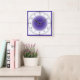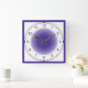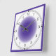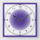 La viñeta en el centro de la cara del reloj es morada (cambia el color de fondo a tu elección). El mismo color enmarca el borde exterior del reloj. Números negros con minutos segmentados alrededor del borde exterior.