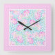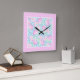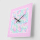 Reloj de pared acrílico cuadrado de bonito, con un patrón de rosas rosas rosas sobre un fondo azul cielo, salpicado de mariposas blancas dentro de un borde de puntos de polka blancos sobre rosa brillante.