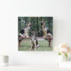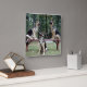 Las fotografías de tres perros pastores alemanes posando sobre y desde un banco son el fondo de este hermoso reloj cuadrado en la pared.