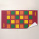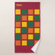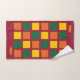 Elegante toallas de baño de color monograma con cuadrados geométricos en amarillo, verde y naranja, sobre un fondo burdeos. Hay un monograma de personalizable, que puede reemplazar con sus propias iniciales o nombre. La decoración del cuarto de baño es moderna. Los elementos coincidentes están disponibles.