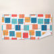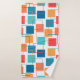Este juego de toallas incluye un paño de naranja claro, una toalla de coral y una toalla de baño con un diseño geométrico de cuadrados en mandarina, amapola, coral y tonos verde azulados dispersos por todo el hotel.