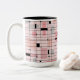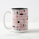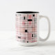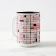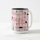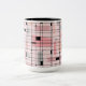 En esta Retro Red Rosa y Starbursts Two Tone Coffee Mug se encuentra el estilo vintage que se une a los tiempos modernos. El fondo es rosa claro, con kitsch, cuadrados y rectángulos fuera de kilómetros en gris paloma y tres tonos rosas. Los caprichosos bloques de color están sobredimensionados y trabajados en algunas de las intersecciones de la cuadrícula. También hay rectángulos negros con líneas verticales y horizontales negras formando un patrón de cuadrícula. Los estribos y cuadros negros se colocan esporádicamente a lo largo de este tapiz de color moderno de mediados de siglo. Este diseño presenta los colores rosas más comunes de los cuartos de baño de época. Agarra tus botas de go y fondo de timbre y disfruta de esto hasta los años 60.