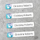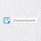 Etiquetas de ropa con una huella de pata blanca sobre un fondo de salpicadura color morado y azul acuático y tu nombre u otro texto personalizado.