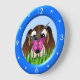 Beagle Puppy Dog and Butterfly - BEBY100 © Sunny Mars Designs. Este adorable personalizado de niños de gran tamaño de la pared de reloj de pared cuenta con un personalizado vectorial ilustracion de un lindo perro cachorro de beagle marrón con una mariposa rosa bonito sentada en su nariz mientras la mira fijamente, con un anillo azul alrededor. Un regalo perfecto para los niños.
