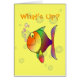Cuál está encima de tarjeta de felicitación colorida de los pescados y de las burbujas. Pescados divertidos del multicolor que soplan burbujas rosadas, con burbujas más transparentes en el fondo. ¿Cuál está para arriba? en una tarjeta amarilla. Añada su propio saludo dentro, o suprima la fraseología interior y deje el espacio en blanco.