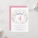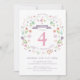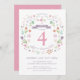 Esta elegante y bonito invitación para el tercer cumpleaños incluye una corona floral ilustrada con las palabras "Celebremos" que rodean el número 4. El color del texto, la fuente y el mensaje se pueden cambiar a su gusto. La parte posterior de la invitación tiene un fondo rosado (que se puede intercambiar a cualquier color de su elección) con un patrón de quatrefoil blanco. Una manera perfecta de invitar a los huéspedes a celebrar un cumpleaños especial de un chica.