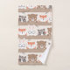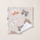 Añada un toque adorable a su pequeño niño o chica con este lindo patrón de animales de bosque. El patrón tiene conejo conejo, oso, mapache, zorro y búho. Al fondo hay puntos de polka blancos sobre marrón claro. En la toalla de mano los animales están saliendo por detrás de un tronco.