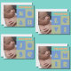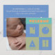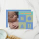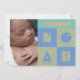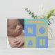 Tarjeta de felicitación con el nombre del bebé de cuatro letras para un bebé recién nacido y sus padres con colores verdes azules. Las 4 letras son personalizables ajustándose al nombre de los niños. Las letras se eligen con un tipográfico tierno para que parezca chillmente figurativo. Añade tu propia foto y personalizar todos los textos según tus deseos.