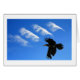 Cuatro nubes de forma de pluma alineadas en el cielo con un cuervo que volaba en primer plano.