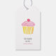 Una etiqueta de regalo con un quequito acuático de color rosa y amarillo, la frase "Gracias" en texto gris, y tu cartel en rosa.