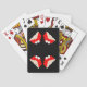 Gráfica de un rack de copas rojas de cerveza llenas de cerveza con dos bolas de ping-pong decoran la parte de atrás de esta baraja de tarjetas de juego para bicicletas. La imagen se repite en las cuatro esquinas y se ha reflejado y girado para que la parte posterior de las cartas sea siempre la misma - no hay tarjetas boca abajo.