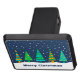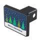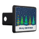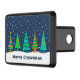 Una hilera de abetos geométricos en verde azulado, amarillo y verde. El cielo es una marina con nieve blanca cayendo. Se lee "Feliz Navidad" en azul marino a juego.
