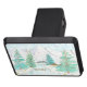 Escena de invierno con montañas nevadas, verduras, cabaña rústica y lago helado. El texto se puede personalizar. Obra de arte original de W.B.