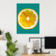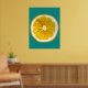 Un lindo y colorido rebanado de limón amarillo de una pintura original de la artista Sacha Grossel. Esta gran fruta de estilo pop art es amarilla y muy brillante y colorida sobre un fondo de color verde azulado azul a medida. Excéntrico y original.