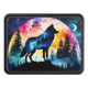 Lobo acuático en la silueta de la montaña contra la luna llena, colorido con nubes y árboles, Ai Generated Art by minx267