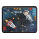 Celebra todas las cosas en el espacio exterior con esta tapa de tono que puedes añadir un nombre para hacerlo personal. Echa un vistazo a los otros elementos de esta colección de abajo, como la mochila, el corredón de mesa y la bandeja de servicio, para que coincidan con esta cubierta de exploración espacial de tipo nerdy. Incluye ilustraciones de actividades en el espacio ultraterrestre e iconos como estrellas, un cohete espacial, un astronauta, luna, satélite y otros elementos del sistema planetario. Agregue un nombre haciendo clic en el enlace "Personalizar" de arriba o elimine el nombre del marcador de posición para hacer de éste una cubierta de trama de patrones de espacio exterior simple