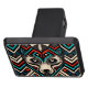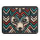 Se trata de una cara decorativa de lobo hecha a mano y estilizada con estampados aztecos en colores negro, rojo, turquesa y beige.