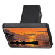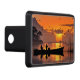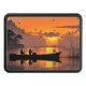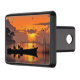Una cubierta de un remolque que muestra pescadores en un bote de pesca al atardecer. Los colores cálidos de la puesta de sol.