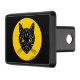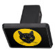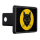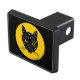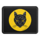 A retro-looking illustration of the face of a yellow-eyed black cat appears in a moon-like circle in this original Halloween-appropriate art by Richard H. Fay.