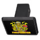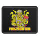 ¡Cubren al bombero completamente vestido en el engranaje contraincendios que sostiene un hacha del fuego en cenizas! ¡Texto rojo y amarillo grande del bombero! ¡Fondo rojo y amarillo llameante del escudo! ¡Regalos de trabajo duros del bombero! ¡Apoye por favor a nuestros bomberos!