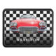 Personalice el nombre en blanco con el coche de deporte rojo sobre fondo de cuadros negros y blancos.