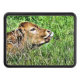 Una hermosa y linda ternera tendida en el pasto largo con la lengua fuera.