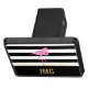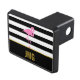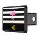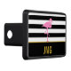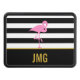 Un flamingo rosa está sobre un fondo rayado en blanco y negro. Debajo del pájaro, hay un falso texto dorado para que agregues tus iniciales (monograma) o un mensaje de personalizado.