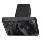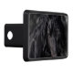 Un caballo frisio del semental brilla tenuemente en el sol como él da una mirada íntima con un ojo, hacia fuera al mundo