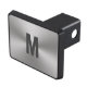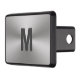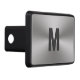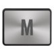 En el centro, un gran monograma gris está sobre un fondo metalizado cepillado. El aspecto metalizado cepillado es una representación artística (no Relieve metalizado).