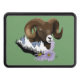 Retrato de una oveja Ram / Bighorn con montañas y flores púrpura en un fondo verde