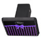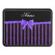 Fondo de patrón de rayas negras púrpura purpurina (no purpurina real) con una cinta color purpurina púrpura (falso purpurina, no real) personalizada con su nombre personalizado regalos o regalos de monograma o sus iniciales con elegantes y tradicionales letras de fantasía